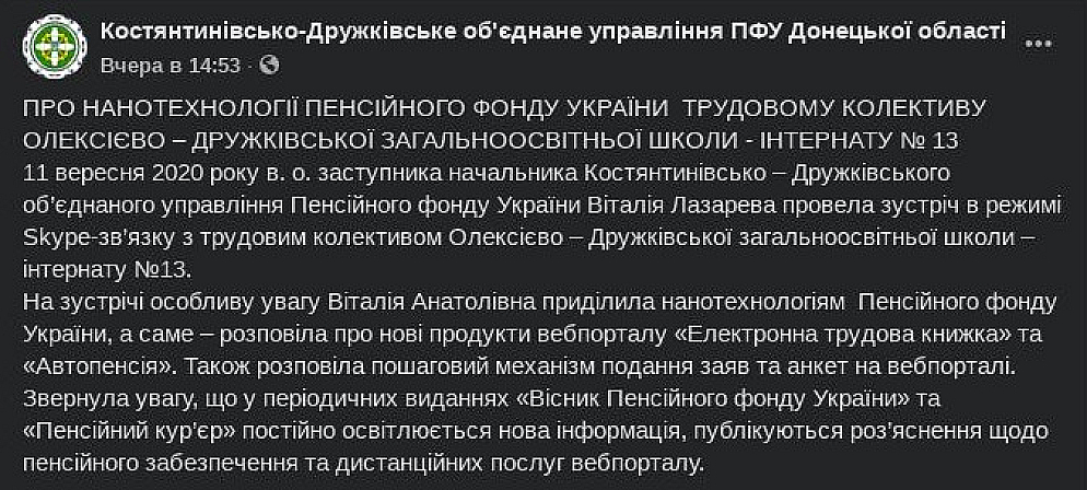 11 вересня 2020 року в. о. заступника начальника Костянтинівсько – Дружківського об’єднаного управління Пенсійного фонду України Віталія Лазарева провела зустріч в режимі Skype-зв’язку з трудовим колективом Олексієво – Дружківської загальноосвітньої школи – інтернату №13.