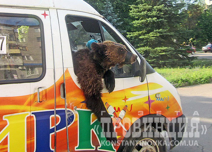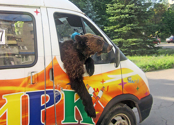 Жители обращаются в редакцию по факту издевательств над животными: уже два дня по городу ездит микроавтобус цирка-шапито "Банзай", из которого высунут на показ молодой медведь, а также на рынках выставляется стол, на котором мучается от жары львенок.