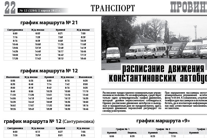 Вниманию константиновцев и гостей нашего города, в сегодняшнем выпуске "Провинции" опубликовано расписание движения городских и дачных автобусных маршрутов.