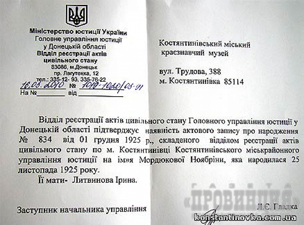 Пришлось им утереть нос - вместе с сотрудниками краеведческого музея пойти в Константиновский ЗАГС и взять справку с печатью, что Ноябрина Викторовна Мордюкова родилась 25.11.1925 в с.Константиновка (город стал числиться с 30-х годов, поэтому "с" скорее всего станция или село). Отец не записан, только мать - Ирина Литвинова.