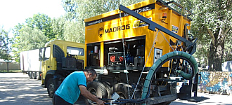 Только что по улице Торецкой (бывшая Пролетарская) у бывшего кинотеатраленина был опробирован новый агрегат для производства ямочных ремонтов, который закупила городская власть.