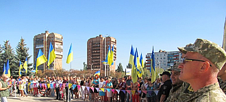 Спочатку о дев'ятій ранку в рамках офіційних урочистих заходів міста та району на площі біля Палацу культури підняли державний прапор.