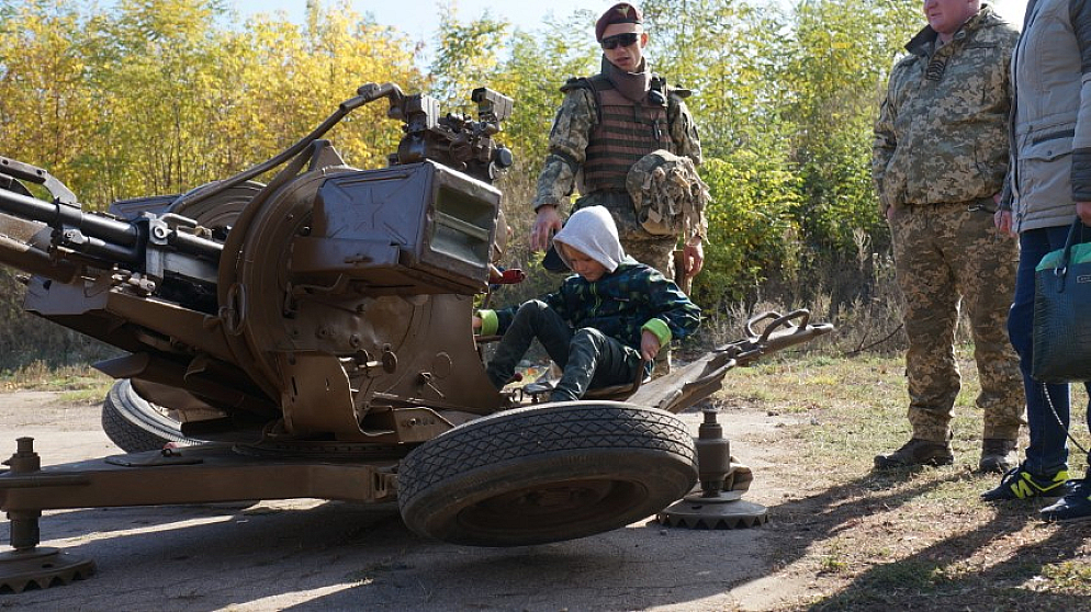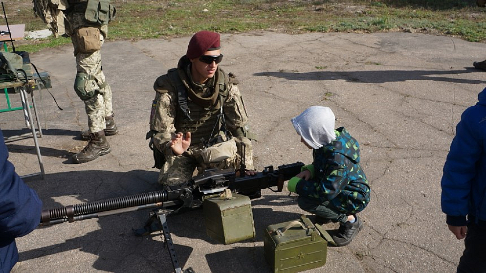 Ось молодий чоловік привів на екскурсію групку хлопців — це вчитель захисту України однієї зі шкіл запросив на виставку учнів-десятикласників. Сміється: “Скористувався зв'язками, бо колись сам служив у цієї бригаді, а зараз викладаю допризовну підготовку у школі”.