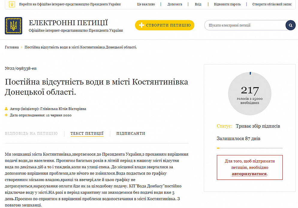Відповідну петицію - “Постійна відсутність води в місті Костянтинівка Донецької області” 12 червня опублікувала на сайті Електронних петицій — Офіційного представництва президента України Глівінська Юлія Вікторівна.